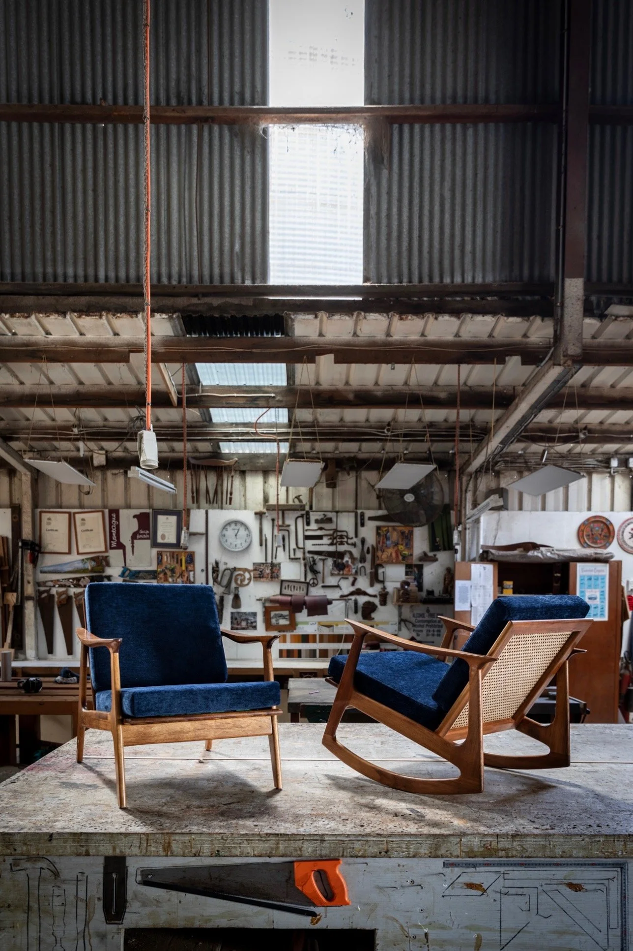 Our school/workshop is located in the grain silos of the old malting factory in Woonona, between the heritage-listed Illawarra escarpment and the beach. The silos were decommissioned in the 1970s and have since been renovated into a variety of workspaces that house steelworkers, woodworkers, and an upholstery studio. The workspace is an eclectic mix of industrial machines with a full collection of hand tools from old Stanley planes to Berg chisels as well as a full range of Veritas tools. Students have access to beautifully crafted Australian-made tools by Chris Vesper of Vesper Tools, Colen Clenton and Ian Wilkie. It is a fully equipped professional woodworking studio where the tutors Stuart Montague & Ed Oliver when not teaching are crafting and restoring furniture.